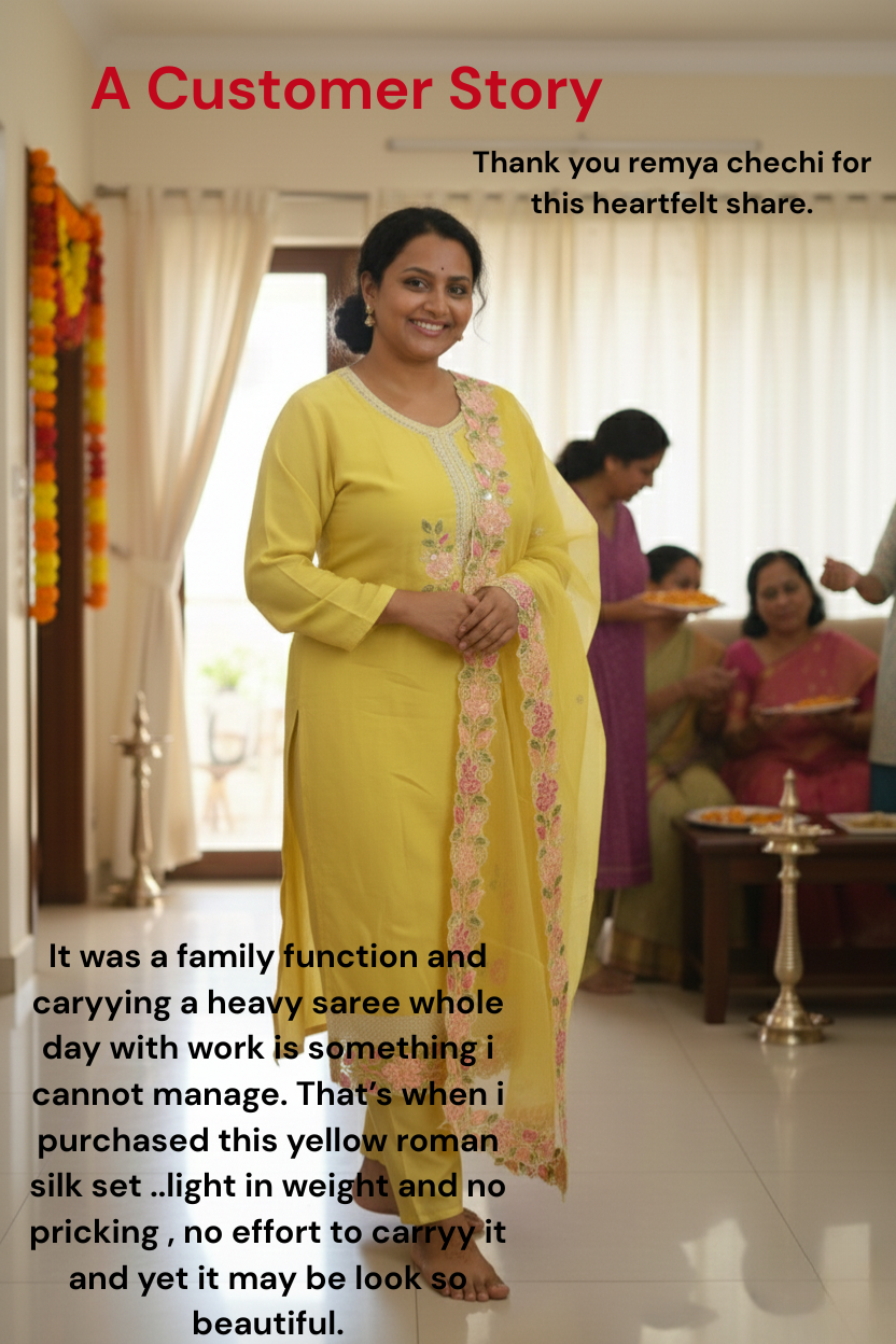 This suit set is the epitome of subtle elegance. It is an ideal choice for festive occasions, family gatherings, or formal events where you want to make a sophisticated statement without overwhelming your look. The combination of rich Roman silk, the meticulous floral and sequin work, and the flattering design makes this outfit a timeless addition to your wardrobe.