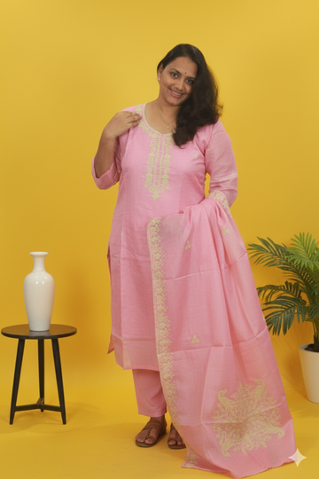 Step into a legacy of elegance with this Elite Kota Doria 3-Piece Suit Set in a stunning, soothing pink. Directly sourced from the looms of Rajasthan, this ensemble is a true testament to the region's rich textile heritage, offering an unparalleled blend of luxury and comfort.