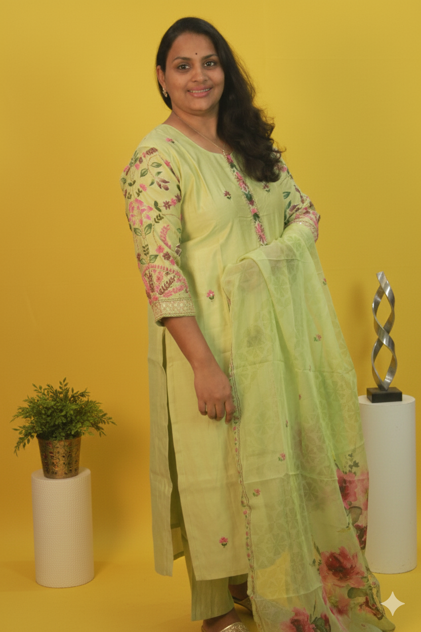 Discover the "Quiet Luxury" of Indian ethnic wear with this breathtaking three-piece ensemble. Crafted from the finest pure silk, this suit set in a soothing pastel pista green hue is designed for the woman who wishes to steal the spotlight with effortless grace.