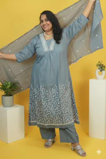 Intricate Embroidery: The A-line kurta is a canvas for stunning artistry, featuring delicate white floral vines that gracefully ascend the lower half. The embroidery is subtly embellished with shimmering sequins, adding a gentle, dazzling sparkle that catches the light with every movement.