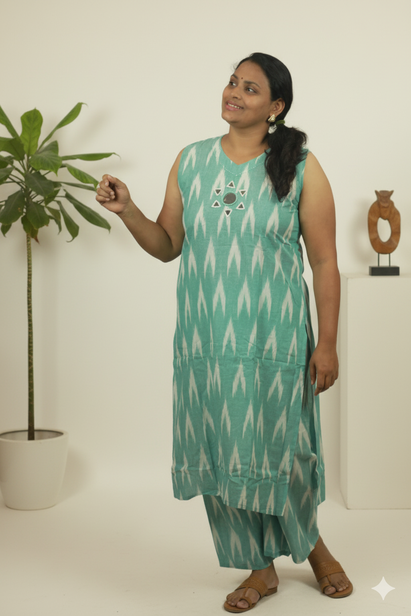 IKKAT COTTON MIRROR WORK MINT GREEN CO-ORD SET