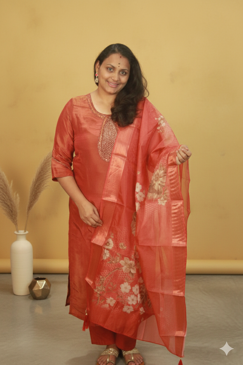 Rust Orange Shimmer Silk Suit Set with Digital Printed Dupatta. Step into the spotlight with...