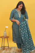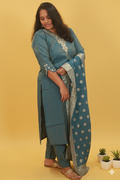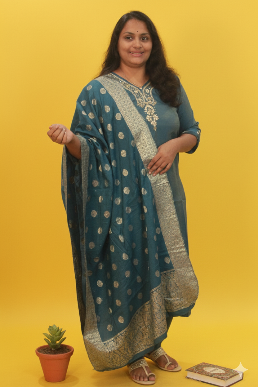 This Teal Shimmer Silk Set with its Zardosi detailing and lavish Banarasi dupatta is more than just an outfit; it’s a celebration of light, luxury, and traditional craftsmanship. Perfect for weddings, festive gatherings, or any special event where you want to dazzle and leave a lasting impression.