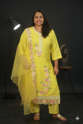 Step into the spotlight with this absolutely divine yellow suit set, a true statement of feminine grace and radiant charm. The rich, sunny yellow fabric provides the perfect canvas for the dreamy, contrasting pink floral embroideries that cascade down the kurta. Each stitch of the delicate pink and green foliage is meticulously placed, transforming this outfit into a walking piece of art. This is more than just clothing; it's a celebration of femininity, designed to make you feel like a gorgeous, ethereal heroine.