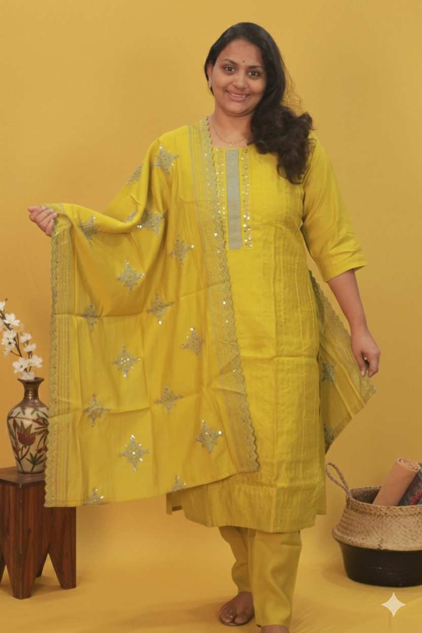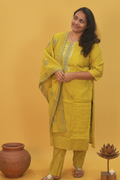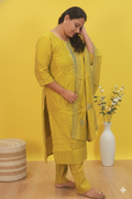Experience the sophisticated charm of a unique color combination that moves beyond the ordinary. The warm, luminous base—a beautiful blend of vibrant yellow and mild olive tones—is perfectly complemented by the serene, intricate grey embroidery. This combination exuberates a warm, sophisticated richness that is both eye-catching and timelessly refined.