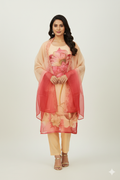 Embrace your inner goddess with this exquisite organza ensemble, a masterpiece of grace and style. The silky-soft fabric drapes beautifully, while the vibrant digital print of the lotus—a symbol of purity and beauty—blossoms across the kurta. Each delicate petal is meticulously highlighted with shimmering zardozi work, adding a touch of regal elegance. This stunning detail catches the light, making the lotus blooms truly come alive. The soft pink and peach tones create a look that's both feminine and ethereal, making you feel like a true lotus princess. This outfit is a perfect blend of modern design and traditional craftsmanship, offering a look that's sure to turn heads.