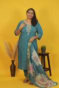Crafted from a gorgeous Shimmer Silk fabric in a serene Sky Blue hue, the straight-cut kurta drapes beautifully and catches the light just so. The sophistication is heightened by the exquisitely detailed jeweled neckline, featuring intricate bead Aari work in contrasting tones, adding a touch of ethereal sparkle and making a statement without being overdone.