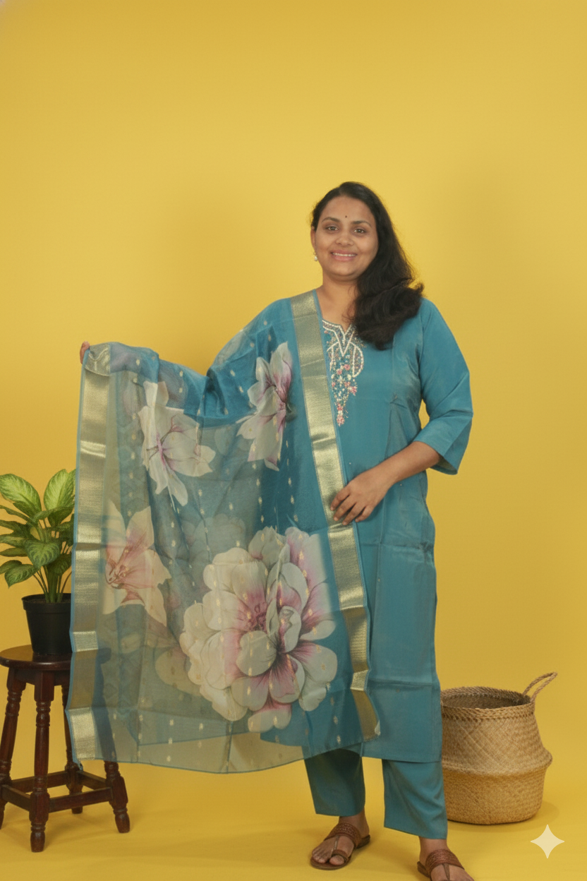 Shimmer Silk Sky Blue Kurta Set with Banarasi Dupatta
