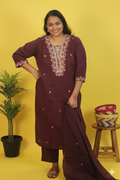 Indulge in the exquisite comfort and captivating style of this Pure Flex Cotton Three-Piece Suit in a rich, sophisticated Plum hue. This ensemble is designed for the modern woman who seeks both premium quality and graceful detailing.