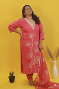 The Kurta features a chic V-neckline framed by heavy embroidery, leading into the striking floral motif that cascades down the front.