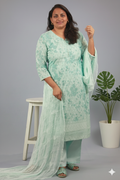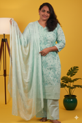 Step into effortless elegance with this premium Hakoba and Chikan Kari pure cotton set in a soothing pearl blue hue. The entire ensemble is adorned with subtle yet intricate chikan embroidery, giving it a timeless grace. The kurta, with its delicate detailing, flows seamlessly into straight-fit pants, while the baby-soft dupatta, fully embellished with fine chikan work, adds a touch of ethereal charm.