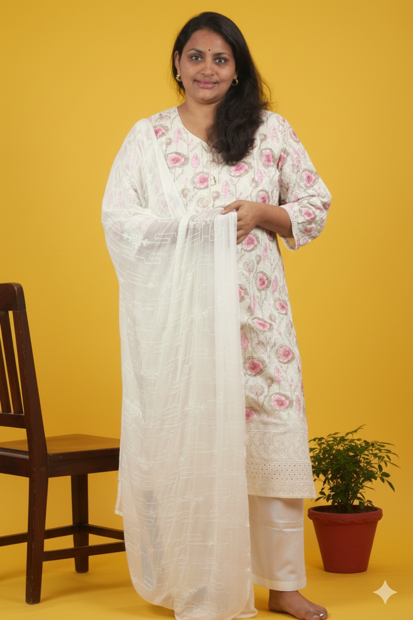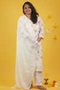 Step into effortless elegance with this premium Hakoba and Chikan Kari pure cotton set in a soothing pearl blue hue. The entire ensemble is adorned with subtle yet intricate chikan embroidery, giving it a timeless grace. The kurta, with its delicate detailing, flows seamlessly into straight-fit pants, while the baby-soft dupatta, fully embellished with fine chikan work, adds a touch of ethereal charm.