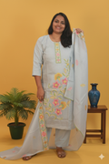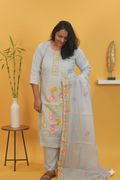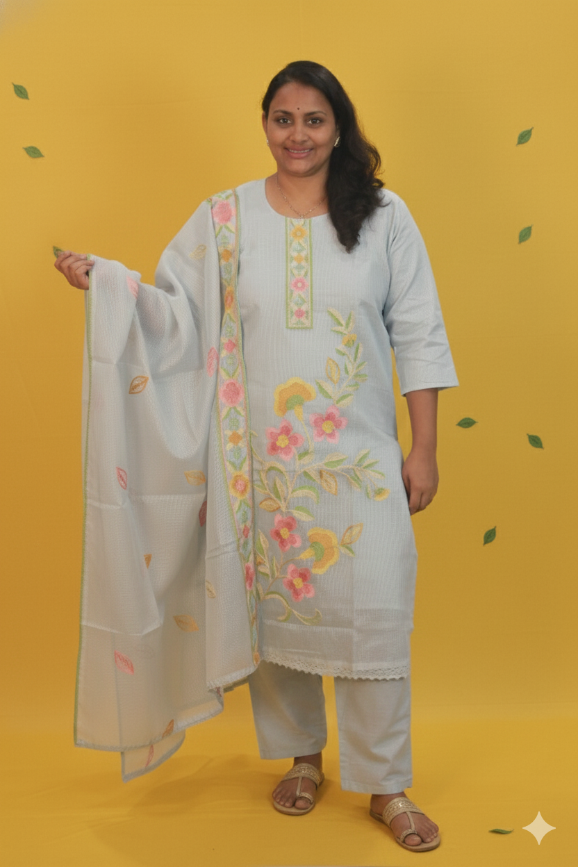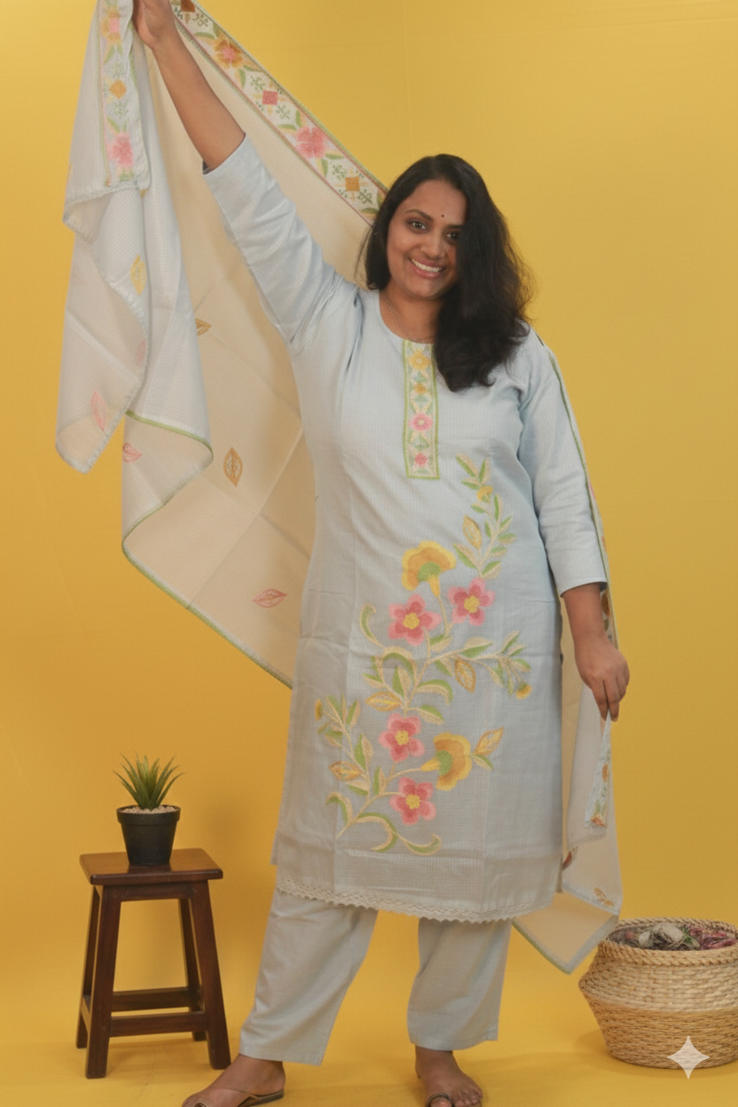 The Kurta and Dupatta are adorned with heavy, multicolored floral embroidery that breathes life into the ethereal ice blue fabric. The vibrant yet tastefully chosen colors of the embroidery (pinks, yellows, and greens) create a stunning contrast, transforming the set into a walking piece of art.
