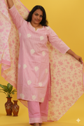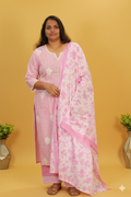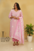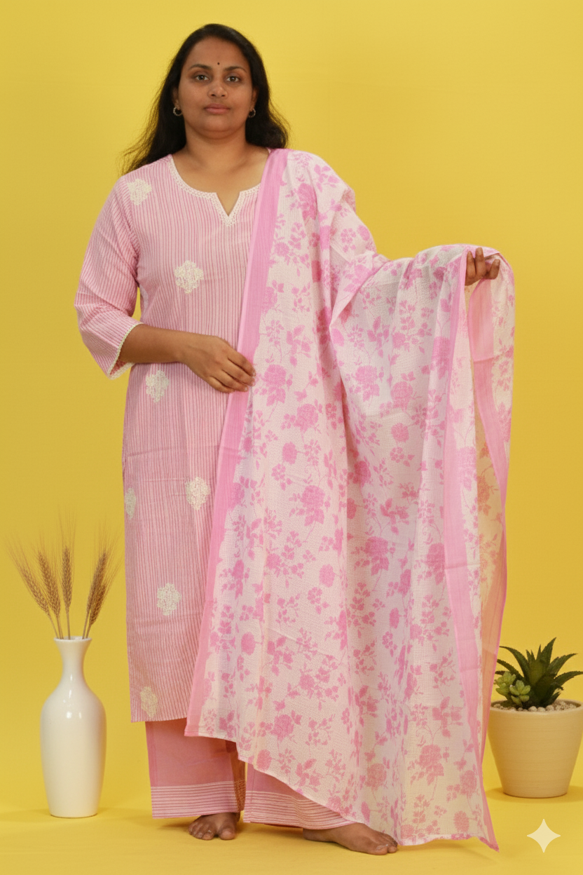 Step into effortless grace with this premium pure cotton palazzo set in soothing baby pink. The kurta features delicate white floral embroidery that adds a subtle charm to its pastel hue, making it perfect for both everyday sophistication and quiet festive elegance. Paired with a matching palazzo for comfort and ease, the look is beautifully completed with a long floral printed dupatta that enhances the outfit’s serene femininity.