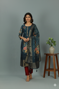 This stunning set comes in rich soft organza, adorned with vibrant orange floral prints that radiate charm and grace. The Banarasi woven borders add a touch of timeless luxury, while the Roman silk wine-colored straight pant creates the perfect contrast, elevating the entire look into sophisticated finesse. A hint of delicate zardozi work on the yoke adds understated elegance, making this outfit an ideal choice for festive evenings, celebrations, or refined gatherings where you want to look effortlessly regal.