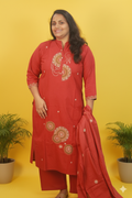 Step into any formal event with unforgettable elegance in our exquisite Brick Red Heavy Cotton 3-Piece Set. This ensemble is the perfect marriage of traditional craftsmanship and contemporary style, designed for the woman who commands attention with her grace.