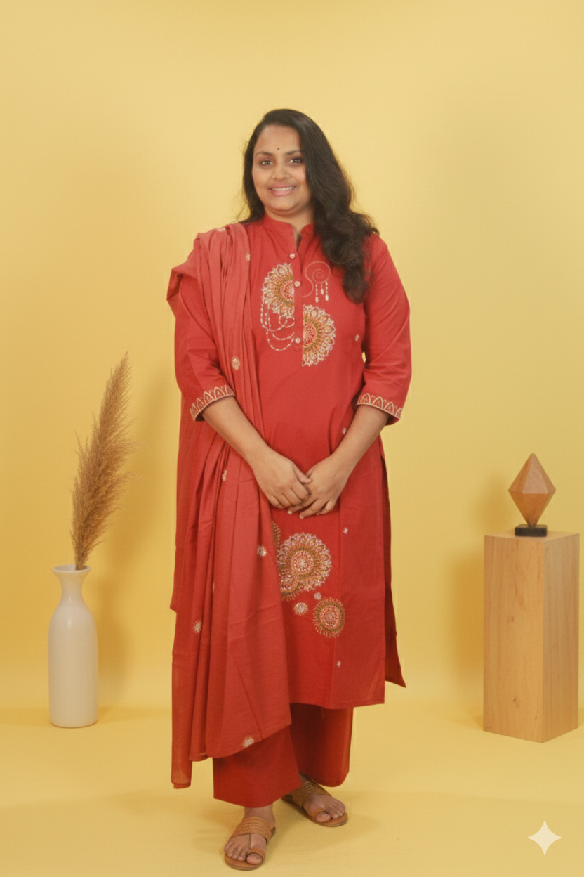 Sarika-pure heavy cotton-brick red-bead embroidered set