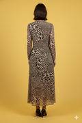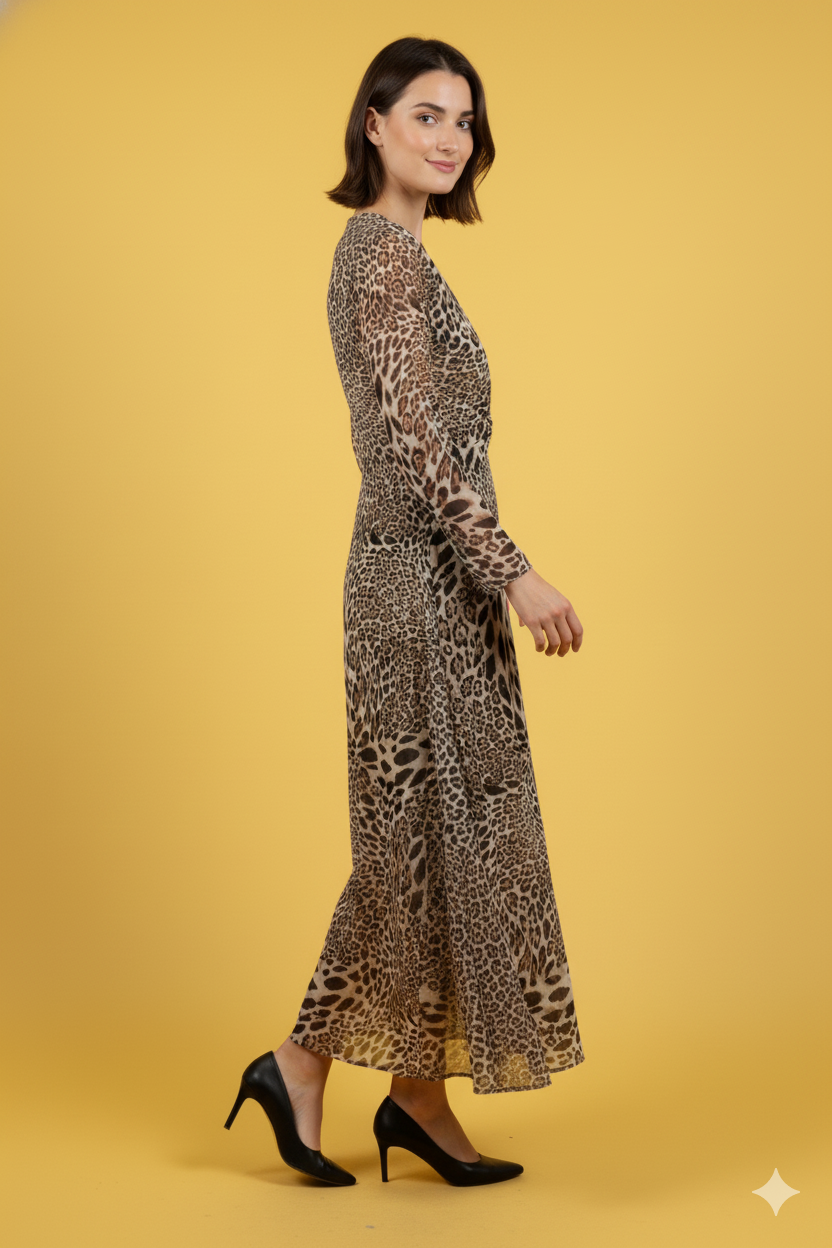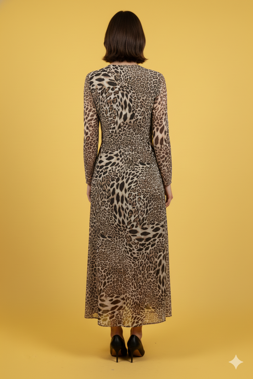 "Fierce yet refined – this imported stone-studded bodycon dress is designed to embrace your curves with a bold animal print and luxurious finish. The perfect blend of glamour and confidence, it’s your statement piece for evenings that demand attention."