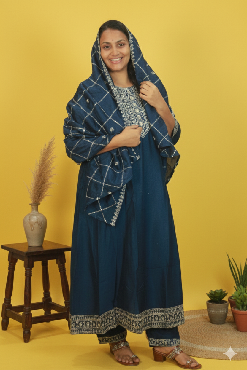 Step into any festive occasion with effortless elegance in this stunning Vichitra Silk Anarkali Set. A true celebration of classic style, this ensemble is designed for the woman who appreciates simple sophistication and rich, timeless appeal.