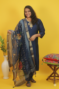 Drape yourself in the luxurious richness of our Deep Blue Rangeela Silk Ensemble—a truly captivating outfit that defines sophisticated style.
